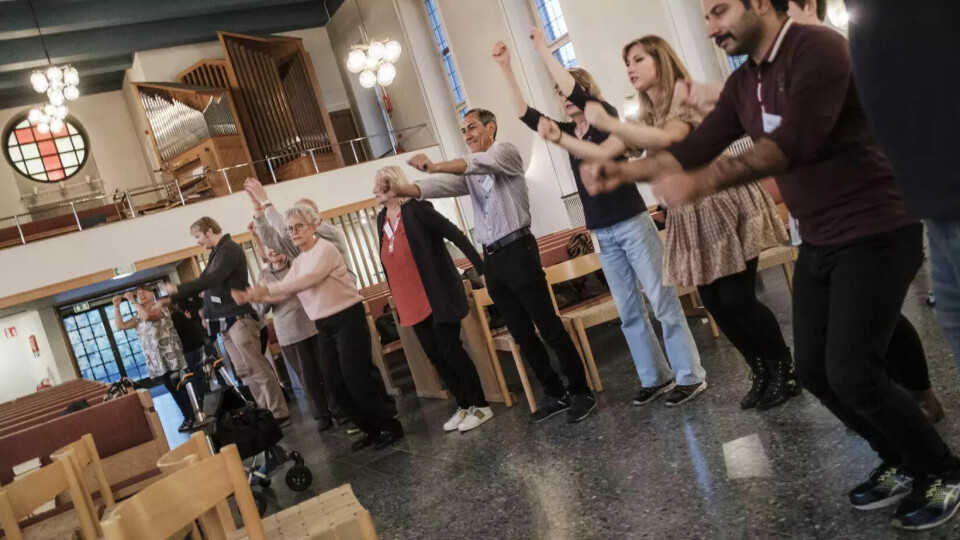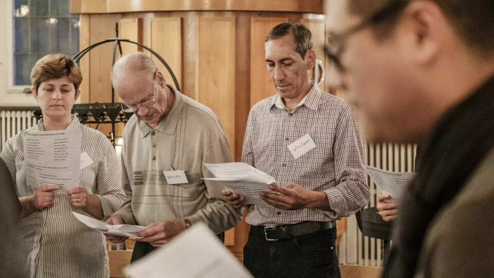 Med mätta magar samlas de 22 deltagarna snart i kyrkorummet. Innan det är dags att ta ton ska de göra några lära känna varandra-övningar, den här kvällen utan att använda sig av ord.
