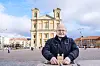 Vi står på Stortorget i Karlskrona, mellan de två kyrkorna Fredrikskyrkan och Trefaldighetskyrkan, framför statyn av stadens store kung Karl XI.