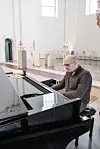 Här brukar Anders Bergström läsa texten till psalm 762, Du är en bön, eller spela den på Steinwayflygeln som står nedanför högkoret. Lika multifunktionell som kyrkorummet blivit, lika mångkunnig är Anders Bergström. Med hjälp av musiken känner vi in rymden.