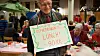 En man lottar ut en lunch på en julmarknad i Ansgarskyrkan i Västerås.