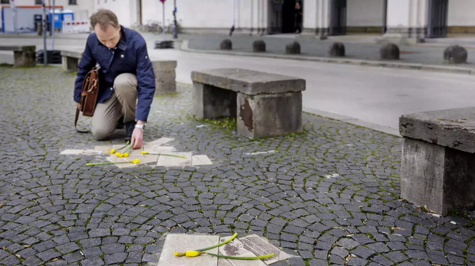 Mikael Mogren vid Vita rosen-monumentet utanför Ludwig-Maximilians-Universität i München. Här, nedsänkt i trottoaren, finns flygblad i sten som håller minnet av de unga studenternas krigsprotest levande. Engagemanget mot antisemitism och förtryck är stort hos Västeråsbiskopen. Foto: Mikael M Johansson
