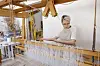 Ett konstverk i oskuldsfullt vitt lingarn vävs fram i konstnären Morris Åkermalms ateljé. Den turkosa färgen till vänster kommer från queervärlden och ska vävas samman med kyrkans blå.
