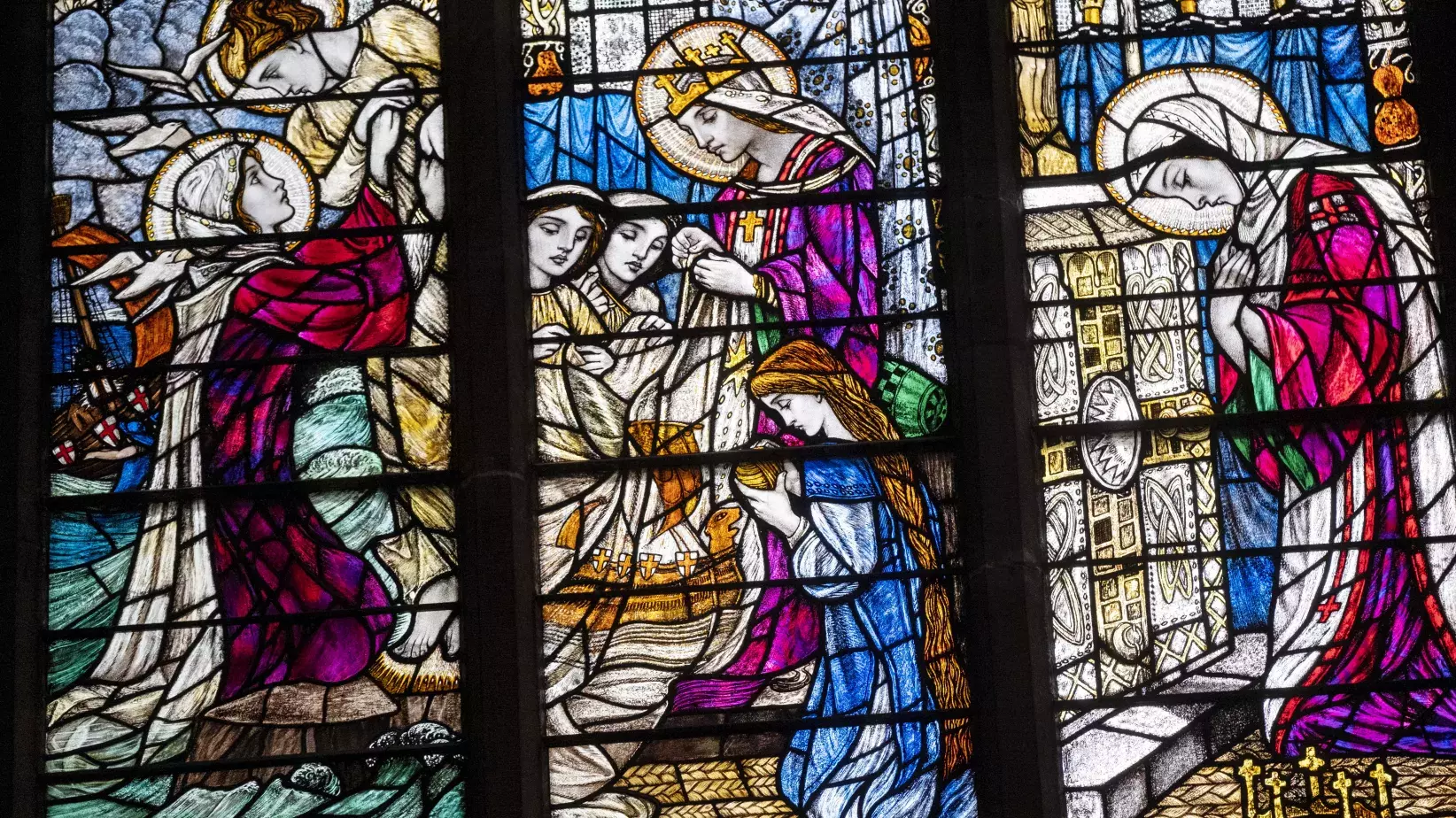 Prinsessan Christina pekar upp mot det blyinfattade fönstret och förklarar vad vi ser. Scenerna är hämtade ur Margaretas av Skottland liv, drottning på 1000-talet och helgon. På marken ligger en krona och handarbete, symboler för kronprinsessan, och stilen är tydligt influerad av Arts and crafts-rörelsen.