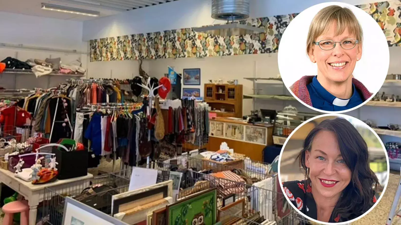 Karin Sarja, kyrkokansliet och Linda Olofsson, Stockholms stift. Stora bilden från second hand-butik på Tjörn.