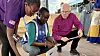 Ärkebiskopen får en förevisning av det enkla paket som flyktingar får vid ankomsten.