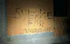På en av väggarna står det "Sverige för svenskarna". På en annan vägg är ett kors målat.