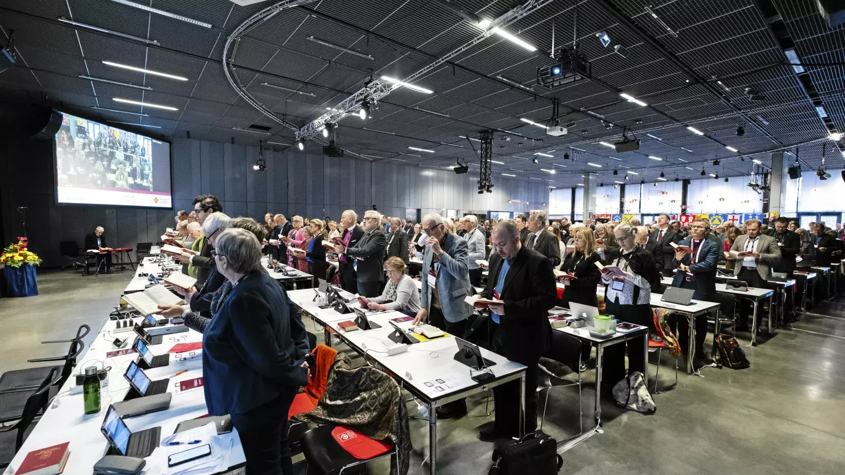 Måndagens förhandlingar inleddes med psalmsång. Foto: Marcus Gustafsson