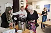 Amina Al Shameri serverar tillsammans med diakon Maria Carlsson fika till Gunilla Ström.