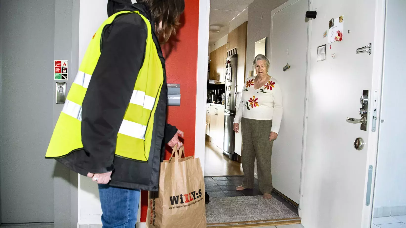 80-åriga Agneta Magnusson i Sköndal öppnar dörren och ler när diakonen Lena Ljungström från Söderledskyrkan räcker över en kasse mat.