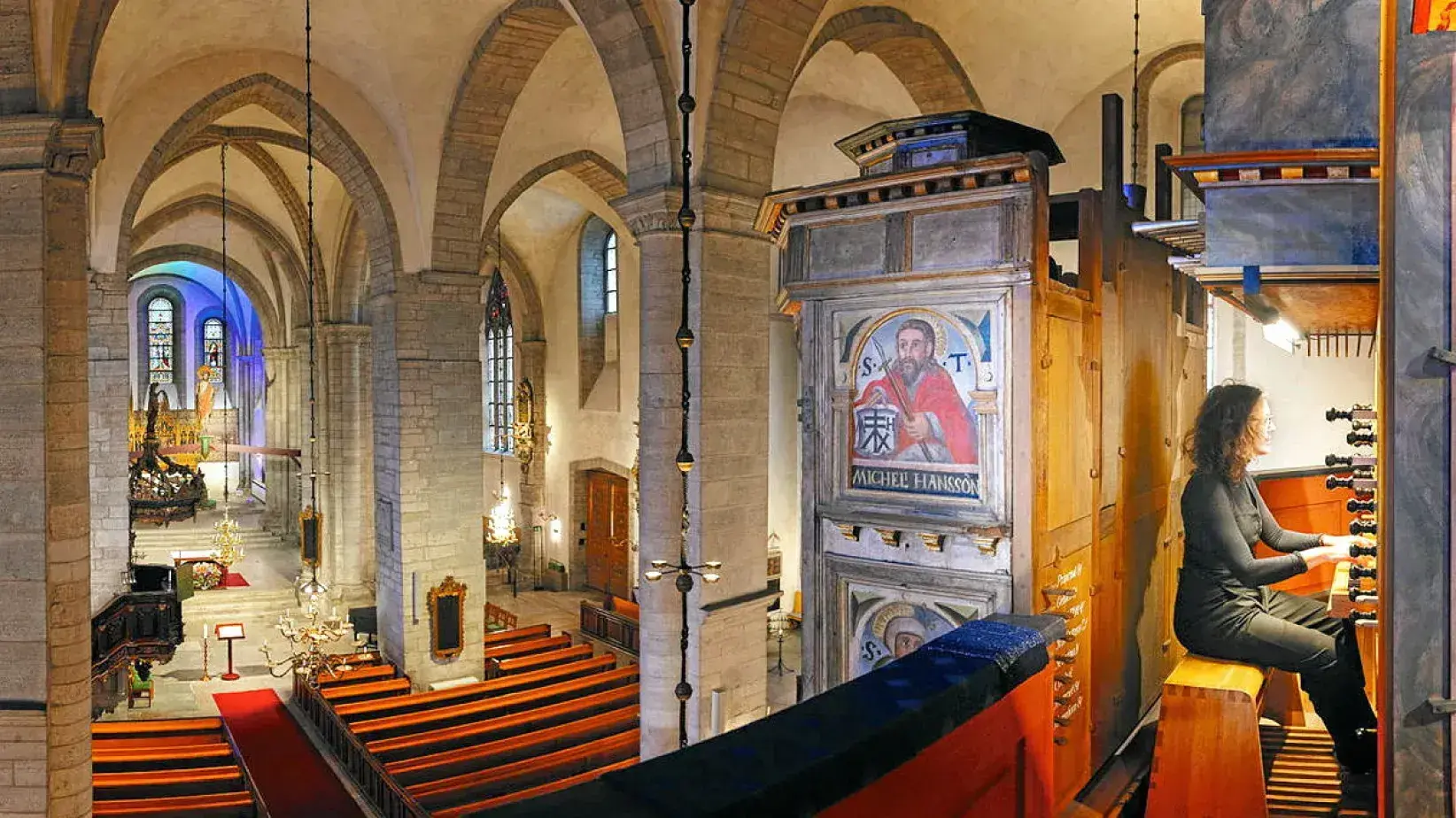 1599 års orgel i Visby domkyrka Sankta Maria. Här ses Alma Emilsson, kantor i Visby domkyrkoförsamling, spela. Fotograf: Anna Sundström.