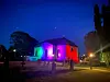 Vaxholms kyrka lyser i Prideflaggans färger för att uppmärksamma Stockholm Pride.