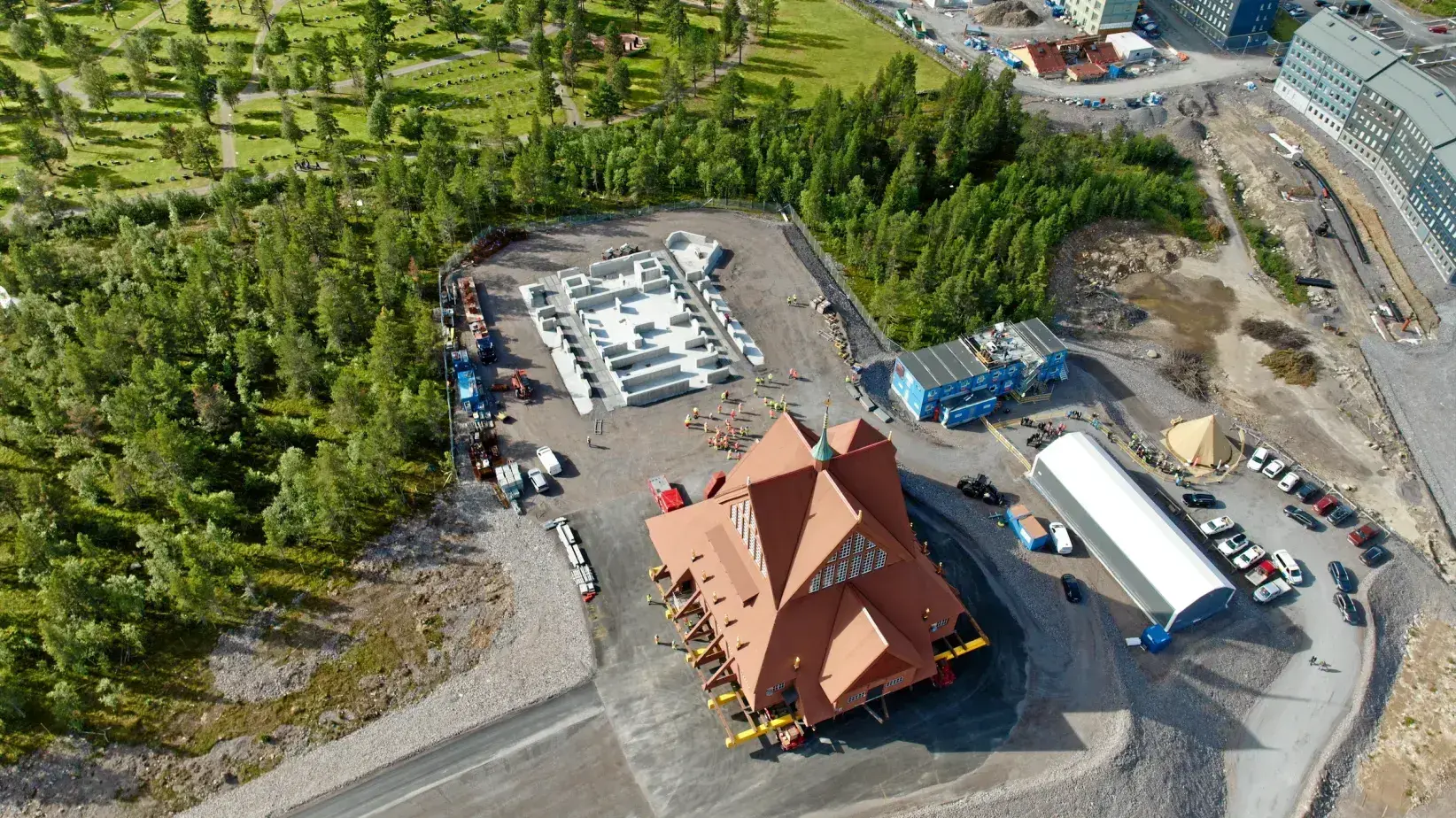 Kyrkan på nya platsen flyttdag två men ännu inte inkörd över grunden. Foto: LKAB