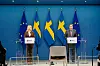Socialminister Lena Hallengren och statsminister Stefan Löfven under måndagens presskonferens.