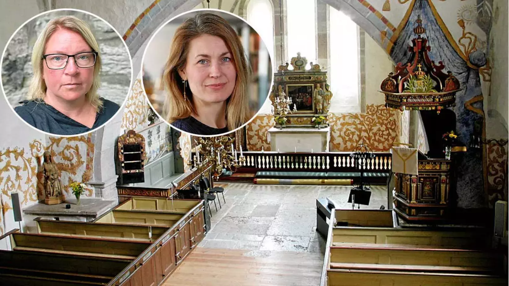 Bro kyrka på norra Gotland är en av de mest besökta kyrkorna på ön. Trots att flera föremål hade plockats undan inför sommarens många besök blev förödelsen stor när någon tömde två pulversläckare i kyrkorummet. Foto: Bo-Göran Kristoffersson och Danne Pe Peterson. Små bilder: Rebecka Svensson, stiftsantikvarie och Susanna Barros,målerikonservator. Foto: Privat och Uppsala universitet.