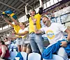 Volontärer har med sig blågula armband att dela ut med texten ”För en rättvisare värld”.