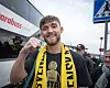 Målvakt Noel Törnqvist då spelarna anländer till stationen i Sölvesborg efter Mjällbys SM-guld.