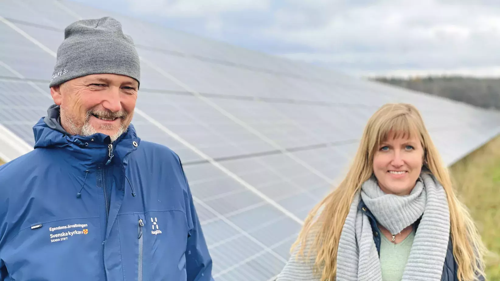 Gert Adolfson, chef för egendomsförvaltningen i Skara stift, och Malin Fahlesson, projektkoordinator, på ett studiebesök i höstas vid HSB Solkraftspark utanför Strängnäs.