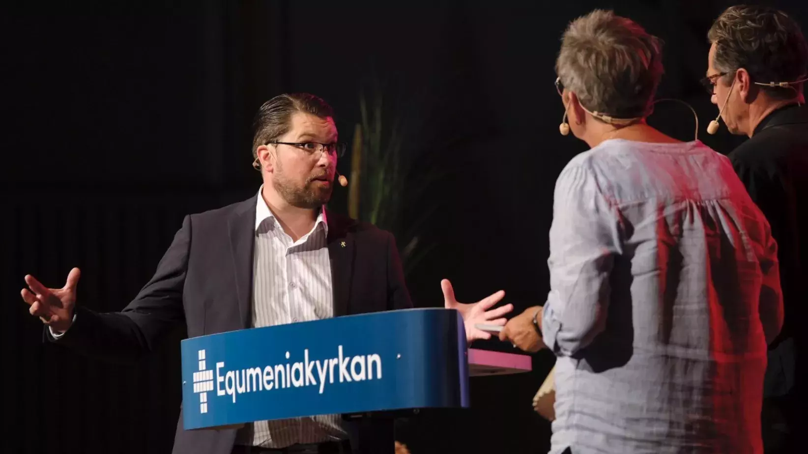 Partiledaren Jimmie Åkesson avslöjade under en utfrågning att Sverigedemokraterna kan lämna kyrkopolitiken. Utfrågningen hölls av Equmeniakyrkan i Vårgårda. Foto: Marcus Gustafsson
